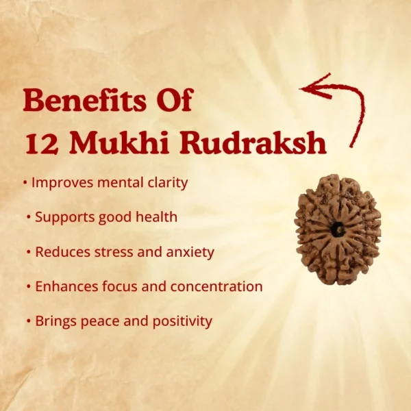 The 12 Mukhi Rudraksha is associated with Lord Surya (the Sun God), representing power, authority, vitality, and self-respect. Wearing this sacred bead is believed to strengthen leadership qualities, enhance confidence, and bring recognition and respect in professional and social life.